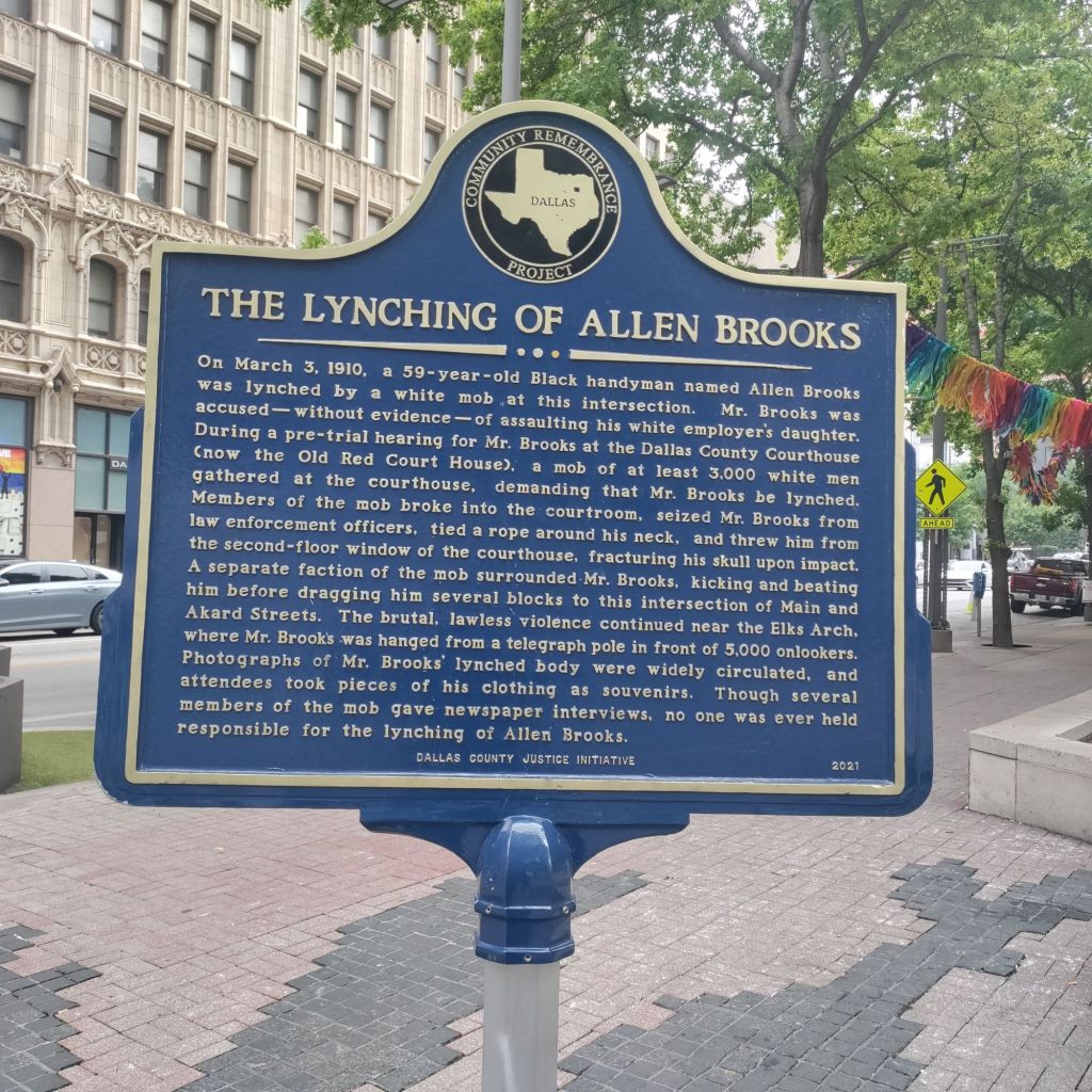 On March 3, 1910, a mob of at least 3,000 white men lynched Allen Brooks, a 57-year-old Black American man, in downtown Dallas, Texas. Brooks was accused of raping a young white girl and was awaiting trial at the Dallas County Courthouse (now the Old Red Courthouse) when the mob broke in, seized him, and threw him from the second floor. Brooks’s skull was fractured on impact, and the mob then beat and kicked him before dragging him to the intersection of Main and Akard streets, where they strung him up on a telephone pole and lynched him. Around 5,000 people watched.